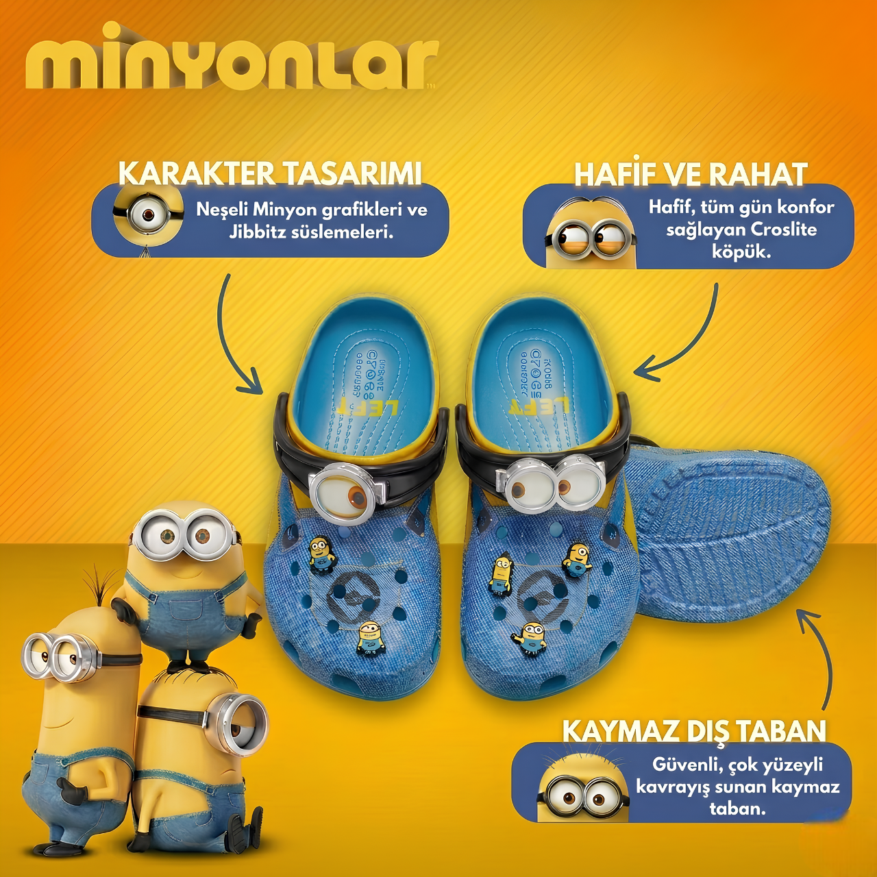 Minyon karakterlerinden ilham alan bu özel tasarım Crocs, eğlenceli görünümü ve hafif yapısıyla gün boyu rahatlık sunar. Yumuşak Croslite köpük tabanı sayesinde ayağı yormaz, kaymaz dış tabanı ile güvenli kullanım sağlar. Çocukların favorisi olan bu model, rahat ve dikkat çekici tarzı seven herkes için harika bir seçimdir.